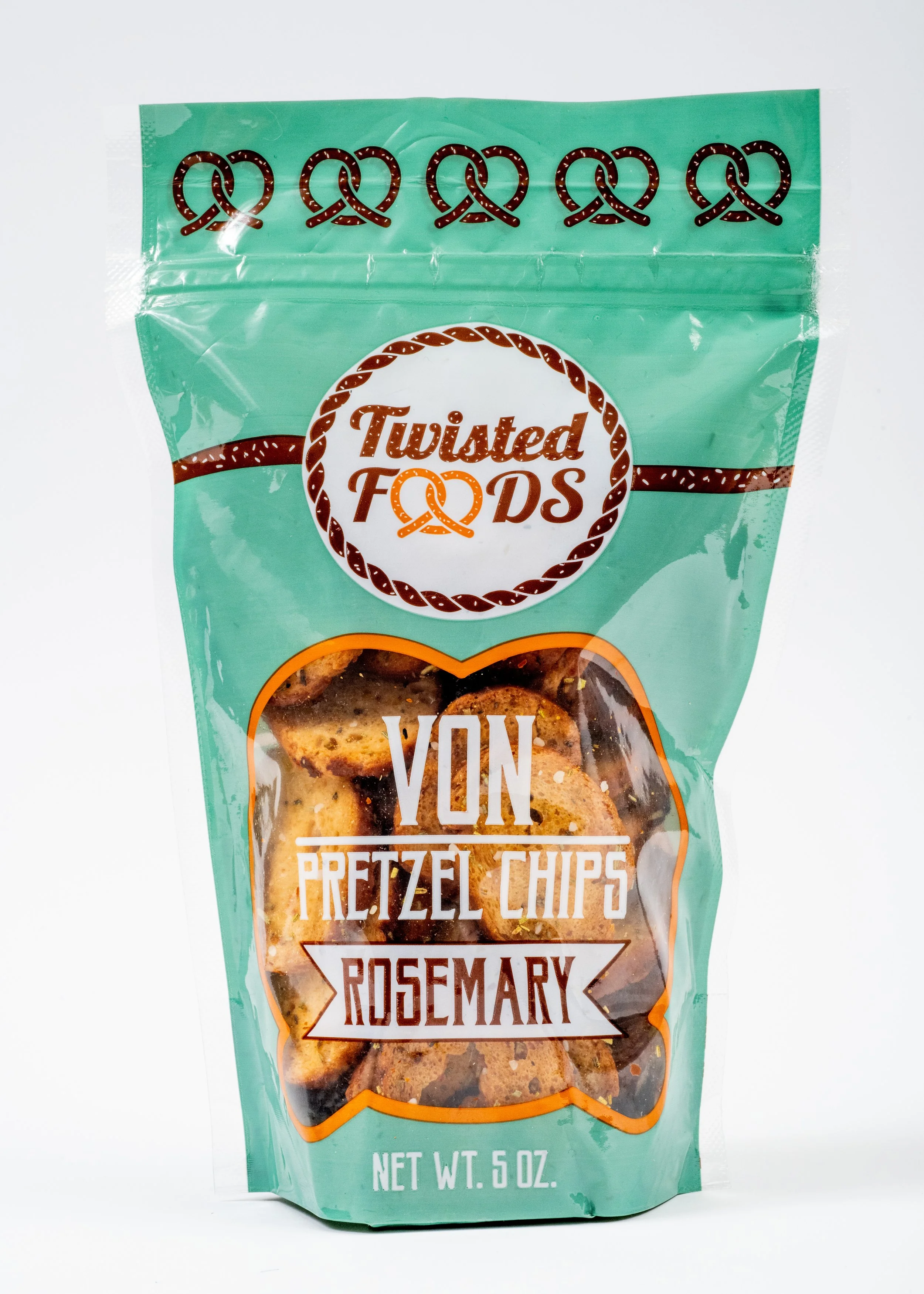 Delicious twice baked Pretzel Chips, seasoned with Rosemary, EVOO and Pretzel Salt. Packaged for multiple servings, or one BIG snack!